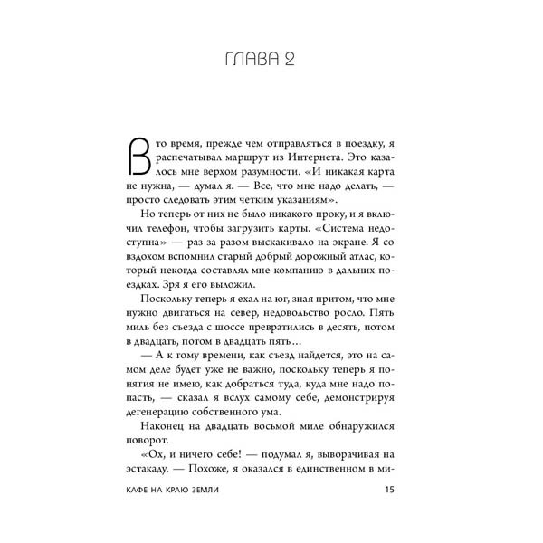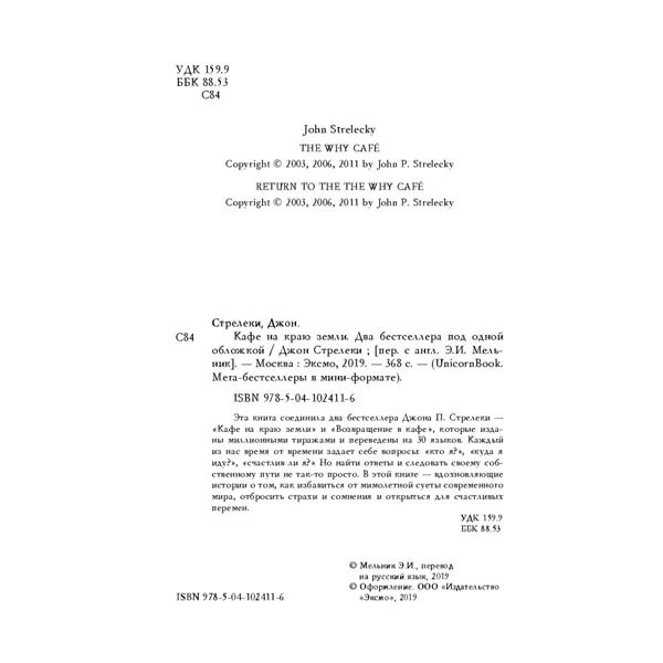 Эта книга соединила два бестселлера Джона П. Стрелеки — «Кафе на краю земли» и «Возвращение в кафе», которые изданы миллионными тиражами и переведены на 30 языков. Каждый из нас время от времени задает себе вопросы: «кто я?», «куда я иду?», «счастлив ли я?» Но найти ответы и следовать своему собственному пути не так-то просто. В этой книге — вдохновляющие истории о том, как избавиться от мимолетной суеты современного мира, отбросить страхи и сомнения и открыться для счастливых перемен.