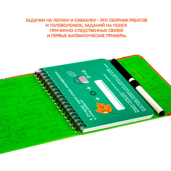 Выберете любое из 30 заданий, помещенных на страницах альбома с магнитной застежкой. Разгадывайте ребусы и угадывайте буквы, решайте математические примеры, находите причинно-следственные связи на забавных картинках – и записывайте результаты маркером на страницах альбома. Ошиблись? Не беда: салфетка уберет со страницы все лишние записи!