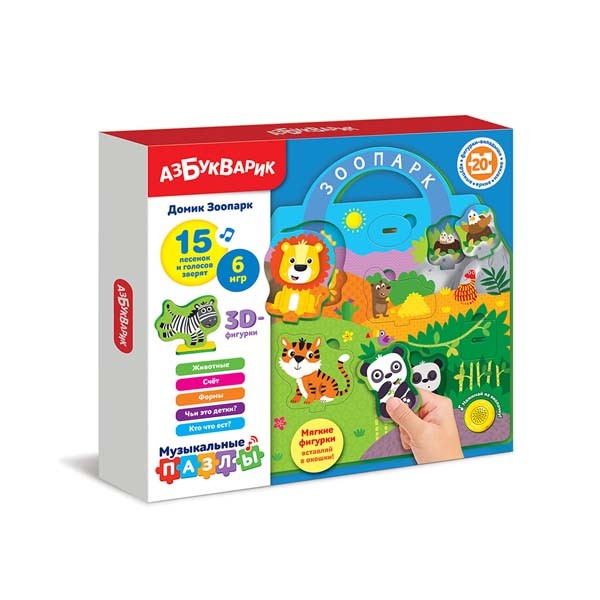 Вставляя мягкие фигурки в нужные окошки, малыш познакомится со зверюшками зоопарка, выучит цифры и формы. Родители могут поиграть вместе с ребенком в обучающие игры: «Считалочка», «Загадки про животных», «Логическая цепочка из фигурок» и др. Такие занятия развивают память, логическое мышление, мелкую моторику. Фигурки животных можно поставить на подставки – и разыграть настоящее театральное представление.