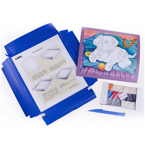 Комплектация: картинка-трафарет, рамка, стек, пластилин и подробная инструкция. Пластилин нетоксичен и безопасен для ребенка.