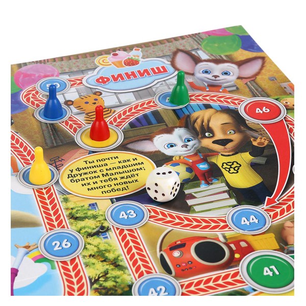 Комплектация: красочное игровое поле, 4 фишки, кубик, правила игры на обороте коробки.
