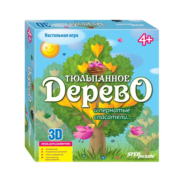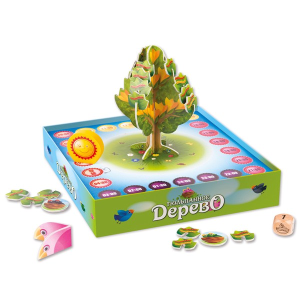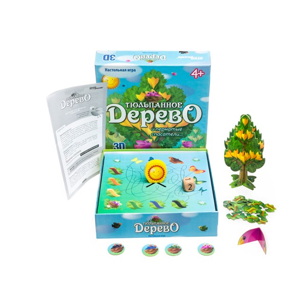 Комплектация: двусторонний игровой планшет (1 шт.); декорация «Тюльпанное дерево» (2 части); жетоны-гнезда (4 шт.); жетоны- листочки с гусеницами (24 шт.); пинцет-клюв (1 шт.); деревянная фишка «Солнце» (1 шт.); деревянный кубик с цифрами и заданиями; правила игры.