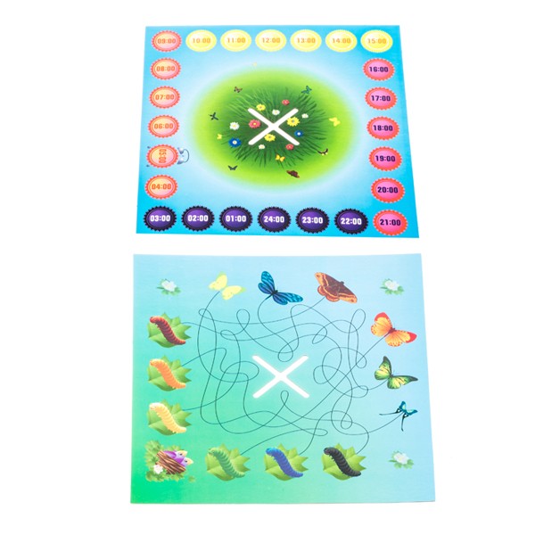 2-й способ. Вариант игры с кубиком. Игроки по очереди передвигают фишку «Солнце» на одно деление вперед и кидают кубик. В зависимости от того, сколько очков выпало на кубике, игроки пинцетом снимают жетоны-гусеницы.