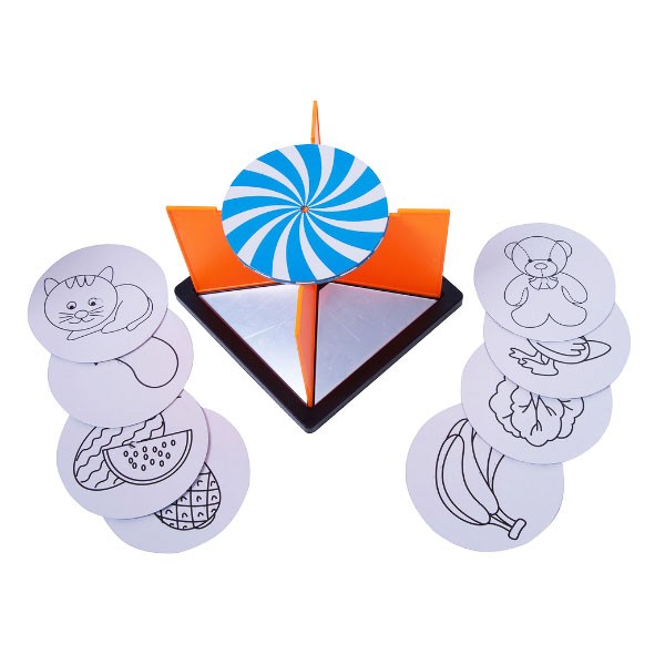 Перед началом игры снимите защитную пленку, установите перегородки в специальные отверстия. Самый юный участник начинает игру. Не подглядывая за рисунком, положите карточку на перегородку картинкой вниз раскрутите карточку. Озвучьте свой вариант изображения на карточке согласно увиденному отражению в зеркале напротив себя. Игра останавливается, участники проверяют картинку. Первый, угадавший изображение, забирает карточку себе. Если карточка не угадана, положите ее обратно в колоду. Побеждает игрок, набравший наибольшее количество карточек.